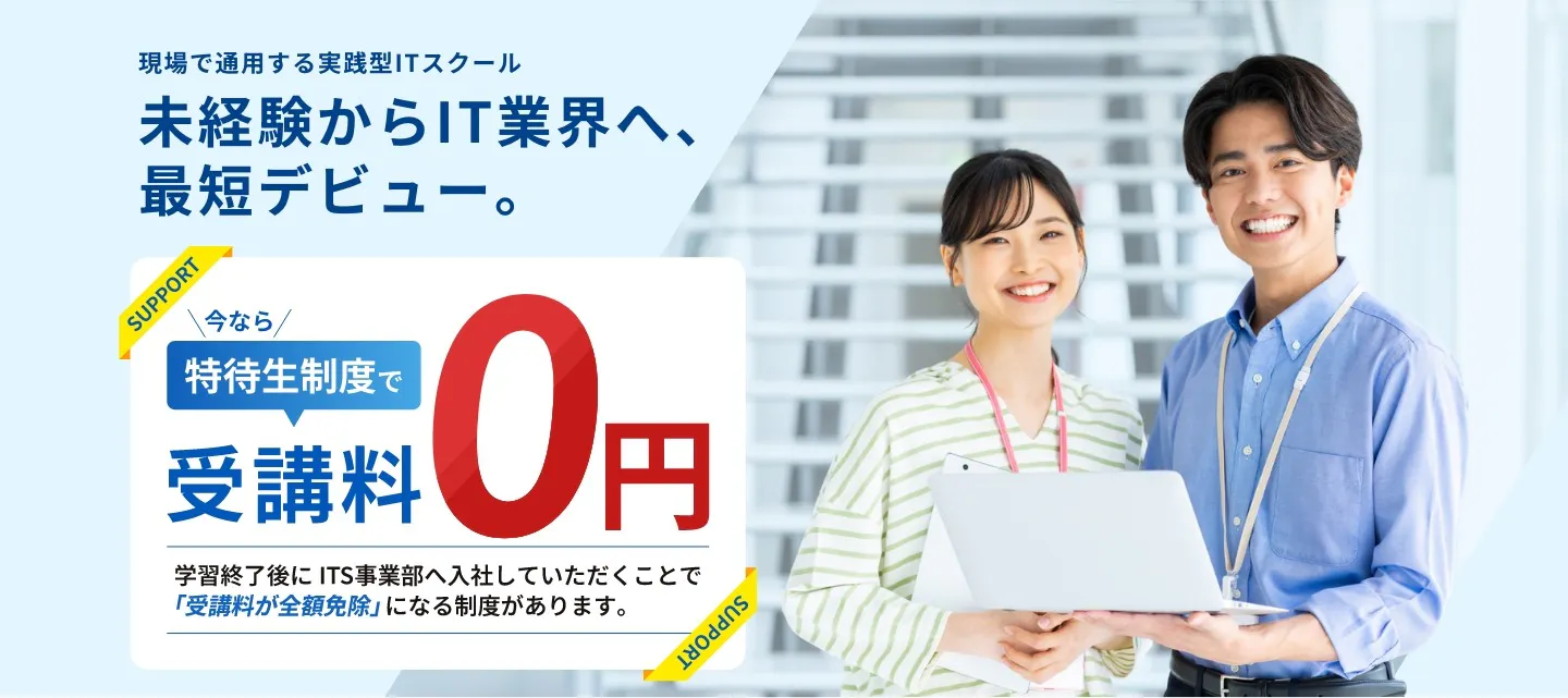 学習終了後にITS事業部へ入社していただくことで、「受講料が全額免除」になる特待生制度を設けており、